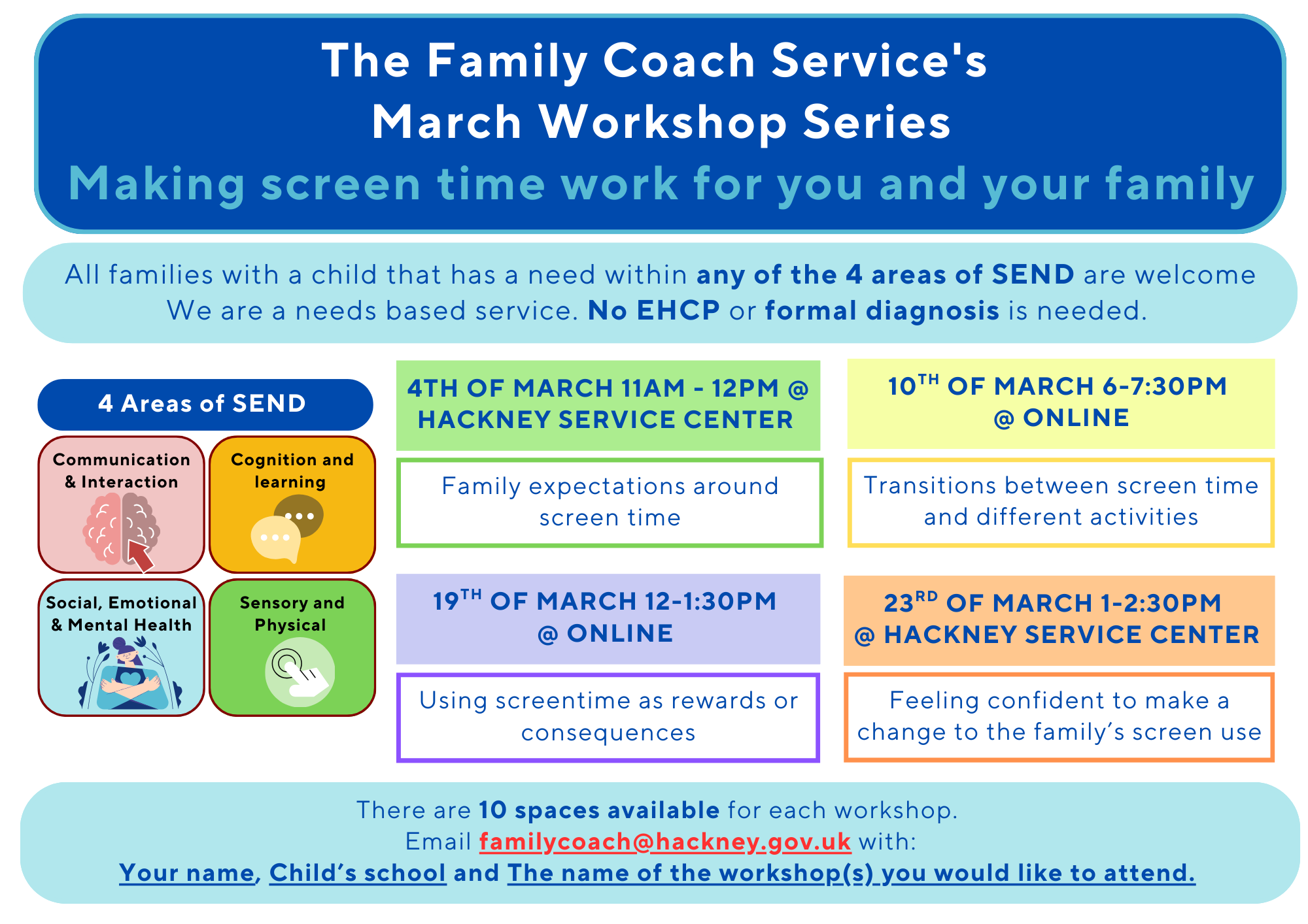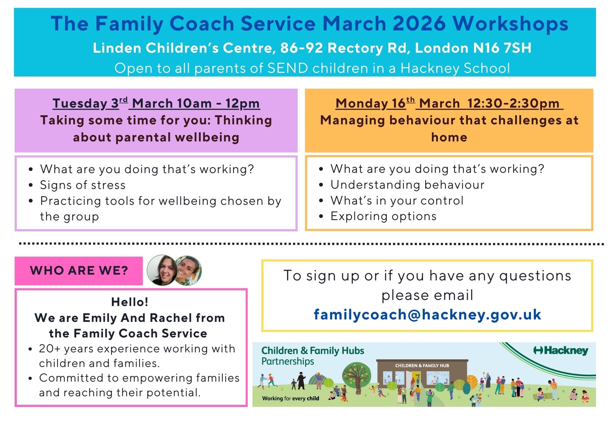 Help & Advice Free School MealsHackney Transport Travel AssistanceSEND Information, Advice & GuidanceGrants & BenefitsHackney Local Offer Useful resources Hackney SEND Services Secondary FAQ guide to Kooth for parents and carers Kindness Assembly on Vimeo Makaton Follow Up self referral info LINDEN June 2026 Makaton for Parents self referral info LINDEN April 2026 What is Developmental Language disorder? ADHD children do not need more discipline ADHD meds do not cause addiction Concentration myth Not an excuse for laziness Understanding Autism Spring Term 2026 Y11 careers chat social story Y11 careers chat with TA social story Countdown to Kench Hill 2026 Kench Hill 2026 SOCIAL STORY Down Syndrome Coffee Morning Wellbeing Walks 2026 Half Term 3 Family Coach Service March 2026 Workshop Linden Childrens Centre Workshop